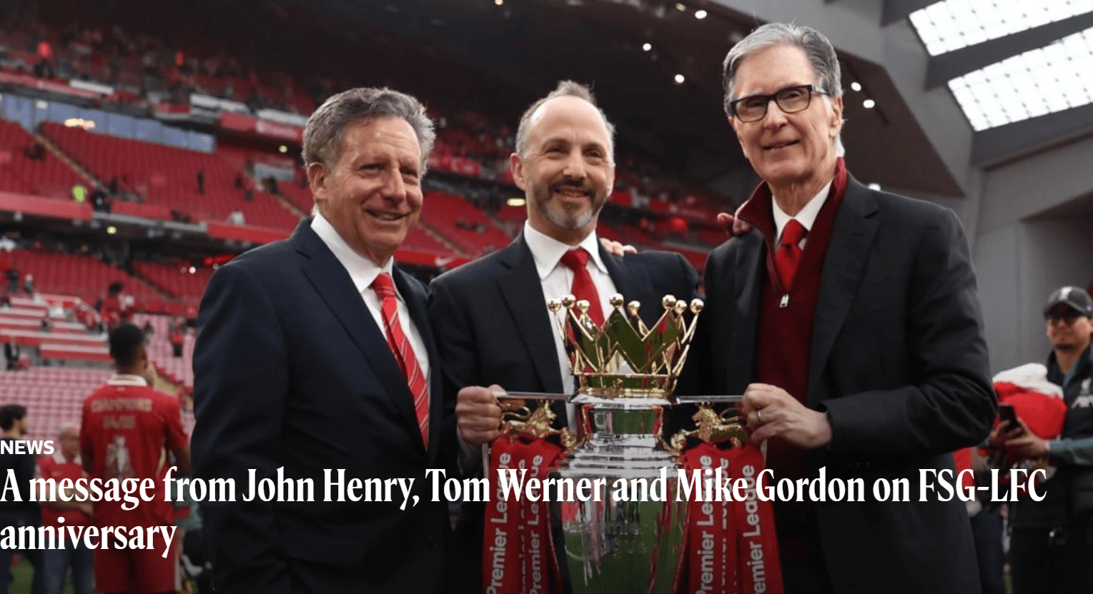 芬威集团入主利物浦足球俱乐部15周年之际,约翰-亨利、汤姆-沃纳和麦克-戈登联合发布了一篇声明,用以庆祝这一伟大事业: